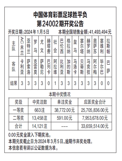 中国体育彩票足球胜平负 第24002期开奖公告
