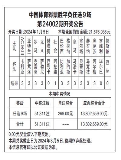 中国体育彩票胜平负任选9场 第24002期开奖公告