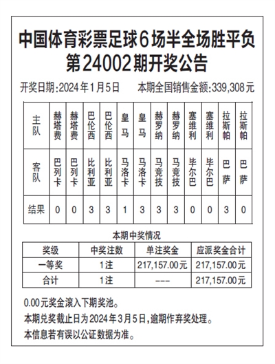 中国体育彩票足球6场半全场胜平负 第24002期开奖公告
