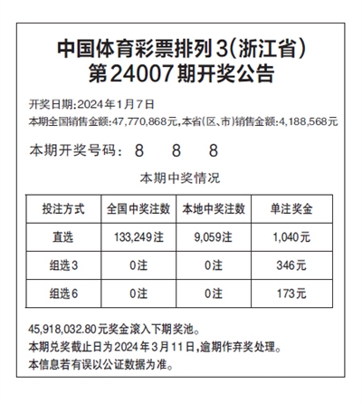 中国体育彩票排列3(浙江省) 第24007期开奖公告