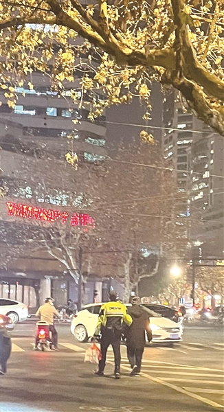 配图是在夜色中,一名警察搀扶着大伯过马路。