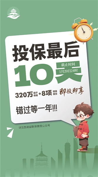 一年一度的限时投保只剩最后10天,错过将无法补缴。微信或支付宝搜“西湖益联保”,几分钟就能办好。赶紧行动起来,为自己和家人添一份保障!