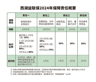 除了扩大保障人群,2024年度“西湖益联保”还在起付线、责任保额和缴费方式上进行了优化,在为投保市民减负的同时,进一步提升大病抵御能力。