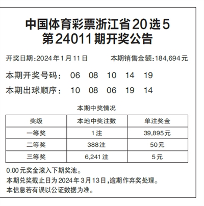 中国体育彩票浙江省20选5 第24011期开奖公告