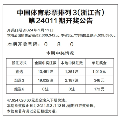 中国体育彩票排列3(浙江省) 第24011期开奖公告
