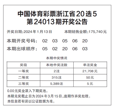 中国体育彩票浙江省20选5 第24013期开奖公告