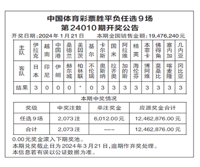 中国体育彩票胜平负任选9场 第24010期开奖公告