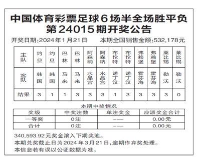 中国体育彩票足球6场半全场胜平负 第24015期开奖公告