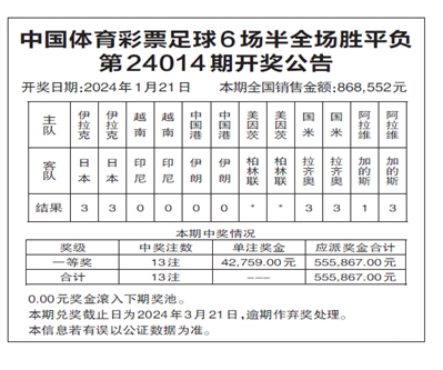 中国体育彩票足球6场半全场胜平负 第24014期开奖公告