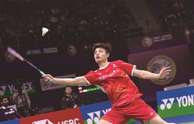 1月21日,石宇奇在比赛中回球。当日,在印度新德里举行的2024年印度羽毛球公开赛男单决赛中,中国选手石宇奇2比0战胜中国香港选手李卓耀,夺得冠军。