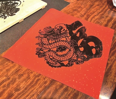 3.把红色宣纸卷起,在刻板底部找到合适的位置,确保画面在纸张中间;