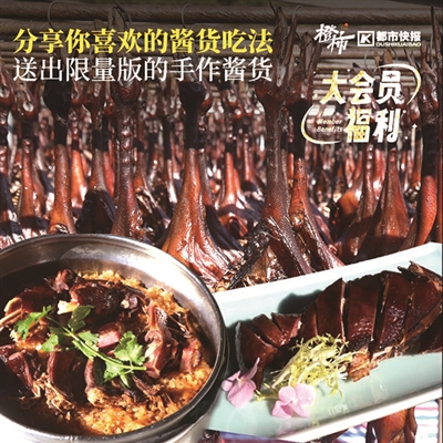 在橙友圈#杭州吃什么#话题下发帖,以图片+文字或纯文字的形式分享你喜欢的酱货吃法,记得带上#酱酱更好吃#标签。我们会以发帖的图文质量、帖子阅读点赞量等指标,选出五位橙友,每位将随机获得西子宾馆、九里云松等出品的酱货(酱鸭或土香肠)一份。