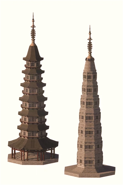 正在尝试复原还没最后完成的保俶塔(左)和现在的保俶塔