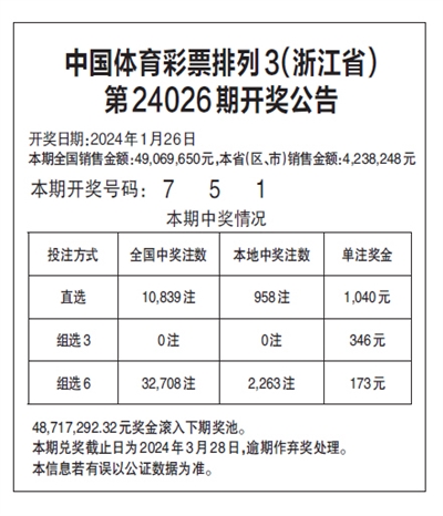中国体育彩票排列3(浙江省) 第24026期开奖公告