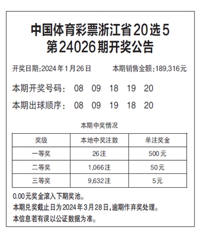 中国体育彩票浙江省20选5 第24026期开奖公告