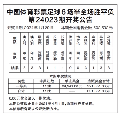 中国体育彩票足球6场半全场胜平负 第24023期开奖公告