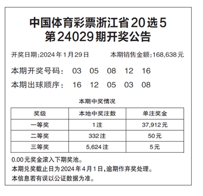 中国体育彩票浙江省20选5 第24029期开奖公告