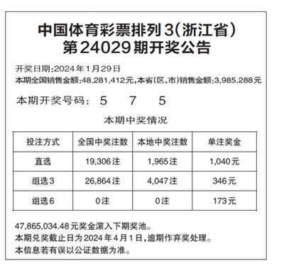 中国体育彩票排列3(浙江省) 第24029期开奖公告