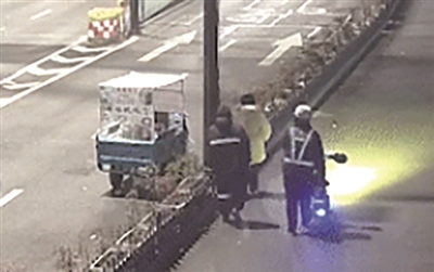 路边卖馄饨的夜宵摊老板刚好经过,和井路海一起跑向女子,两人一边配合拦截车流,一边将女子拉回路边,报了警。