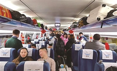 2月1日6点半,随着G4835次列车缓缓驶出杭州东站,160名黔籍务工人员踏上回家的路。列车7号、8号车厢内,火红的春联、灯笼、大大的“福”字映衬着节日的喜庆。