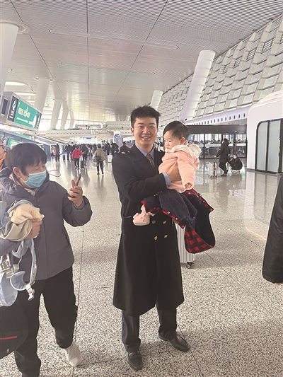市民刘女士一个人抱着2岁的宝宝来坐车,她想去上卫生间,但抱着宝宝拖着行李很不方便,“我只能去求助铁路工作人员,他们马上热心地把孩子抱了过去,那一刻真的心里好暖,当我回去接孩子的时候,看到孩子正和‘铁爸’玩得开心呢!”