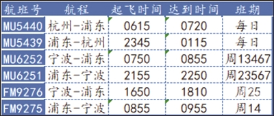 2月23日起,东航将新增杭州-浦东的往返直飞航班,每天飞一班,4月1日起加宁波-浦东航班每天一班。