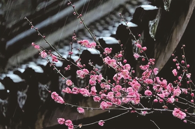 这儿的梅花适合远观。绵绵细雨打在薄如蝉翼的花瓣上,远远望去,仿佛一幅如烟缥缈的山水画。