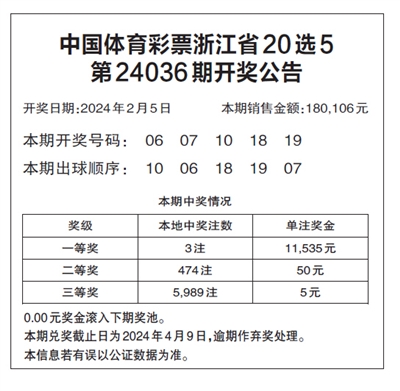 中国体育彩票浙江省20选5 第24036期开奖公告