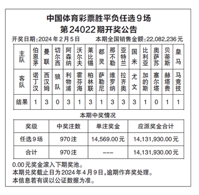 中国体育彩票胜平负任选9场 第24022期开奖公告
