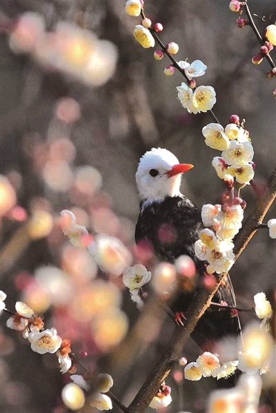 第二朵 橙友@辰曲16:初一游孤山梅园,在一棵盛开的白梅花丛中,惊喜地发现一只漂亮的鸟,红红的小嘴,白白的脑袋,正躲在梅花丛中吸食花蜜。