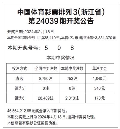中国体育彩票排列3(浙江省) 第24039期开奖公告