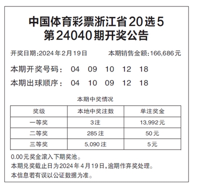 中国体育彩票浙江省20选5 第24040期开奖公告