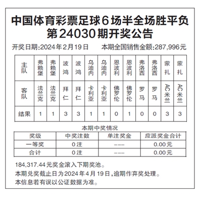 中国体育彩票足球6场半全场胜平负 第24030期开奖公告