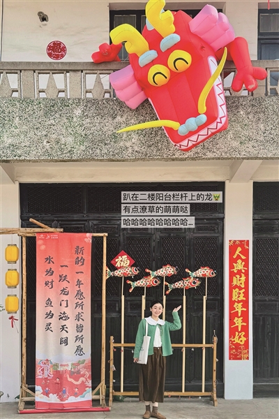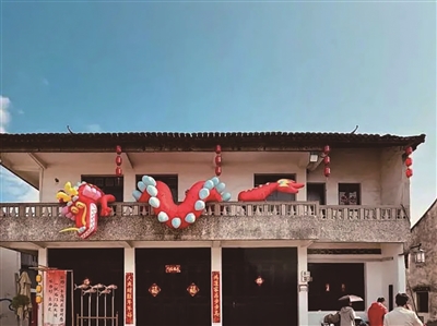 走到老街尽头是一个小广场,一条可爱的充气龙盘在广场边一座二层小楼二楼阳台栏杆上,笑眯眯地看着广场上人来人往。