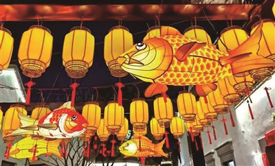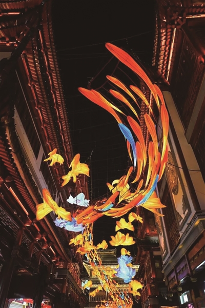 凝晖路的“一夜鱼龙舞”,被誉为“中式浪漫天花板”。缤纷多彩的鱼群汇聚成游龙回旋之姿,游走在飞檐斗拱之间,将辛弃疾《青玉案·元夕》中所描绘的元夕灯会繁华之景,带到今时今日今宵。