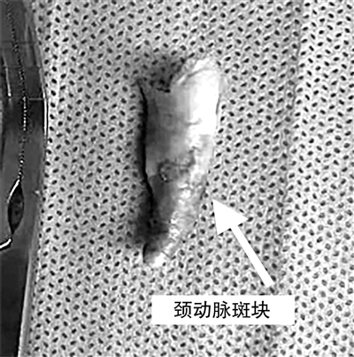 当天下午3点,蒋劲松教授和陈乐高一起给老马做了颈动脉内膜剥脱术。术中发现老马的颈动脉斑块很大,已经把90%的血管管腔都堵塞了,一番操作后,顺利完整地取出了小拇指大小的斑块。