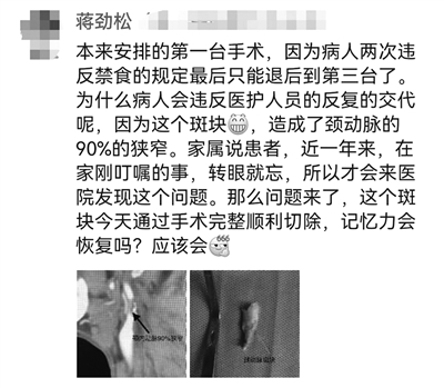 当地医院检查发现,老马的颈动脉有重度狭窄。医生说,颈动脉狭窄会引起老人家脑部供血不足,有的人就是表现为记忆力明显下降,严重的则会引起脑缺血、中风。老马的女儿在网上查询得知蒋劲松教授是这方面专家,专程带着父亲来杭州求医。