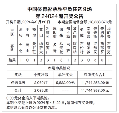 中国体育彩票胜平负任选9场 第24024期开奖公告
