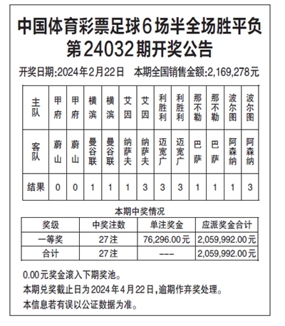 中国体育彩票足球6场半全场胜平负 第24032期开奖公告