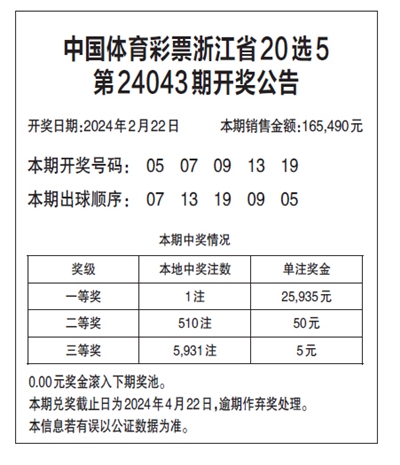 中国体育彩票浙江省20选5 第24043期开奖公告