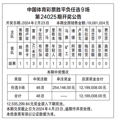 中国体育彩票胜平负任选9场 第24025期开奖公告