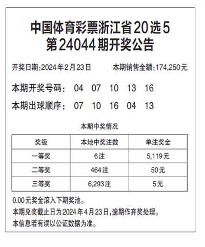 中国体育彩票浙江省20选5 第24044期开奖公告