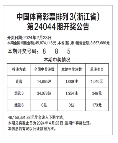 中国体育彩票排列3(浙江省) 第24044期开奖公告