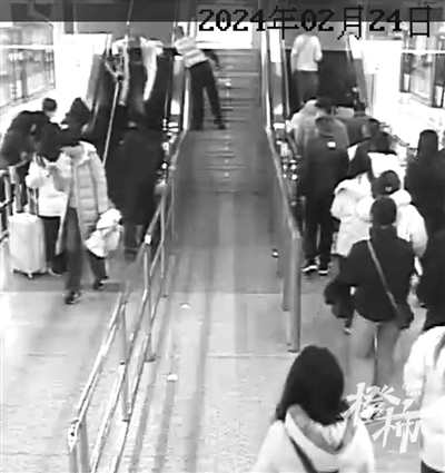 鱼贯而入的乘客不知前方情况,紧急按钮一按电梯一停,扶梯上的人会惯性前冲。打铁关站派出所所长王曦正好在站内巡逻,赶紧走到边上步行楼梯以防意外,果然,一个穿大衣的女孩一个趔趄,幸好被王曦伸手一把拉住,没有摔倒。