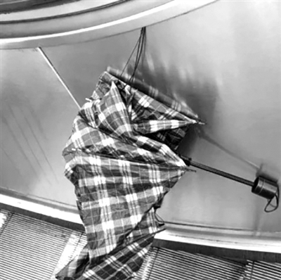 大家都以为长柄伞尖头触地,容易卡住电梯,其实折叠伞也会。地铁公安民警说,我们乘扶梯时,都会把折叠伞收起握在手里,但折叠伞收好后,四周的伞骨尖还是像“刺猬”的刺一样朝上,如果紧挨扶梯,这些“刺”就可能卡在扶梯缝隙里。还有人虽然收起了伞,但伸缩杆没缩进去,长长的伞像长着刺毛的喇叭花一样,也会卡在缝隙里。