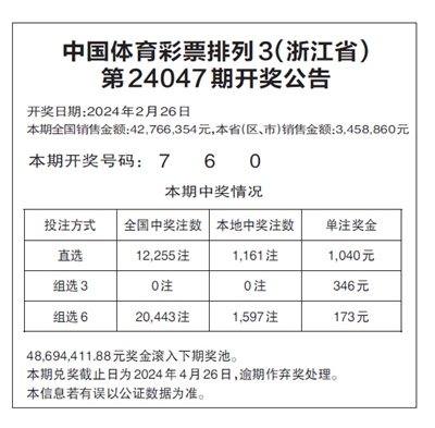 中国体育彩票排列3(浙江省) 第24047期开奖公告