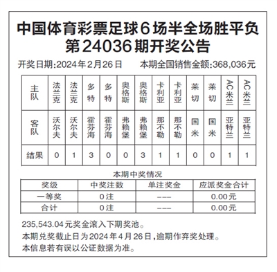 中国体育彩票足球6场半全场胜平负 第24036期开奖公告