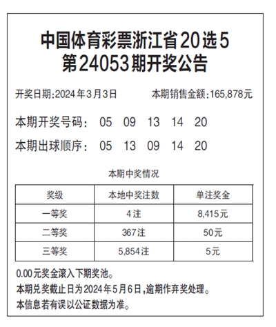 中国体育彩票浙江省20选5 第24053期开奖公告