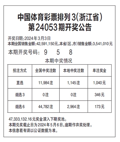 中国体育彩票排列3(浙江省) 第24053期开奖公告