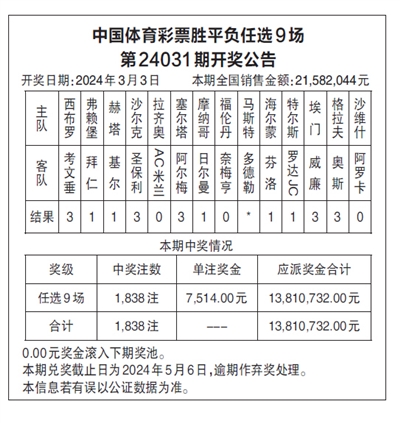 中国体育彩票胜平负任选9场 第24031期开奖公告